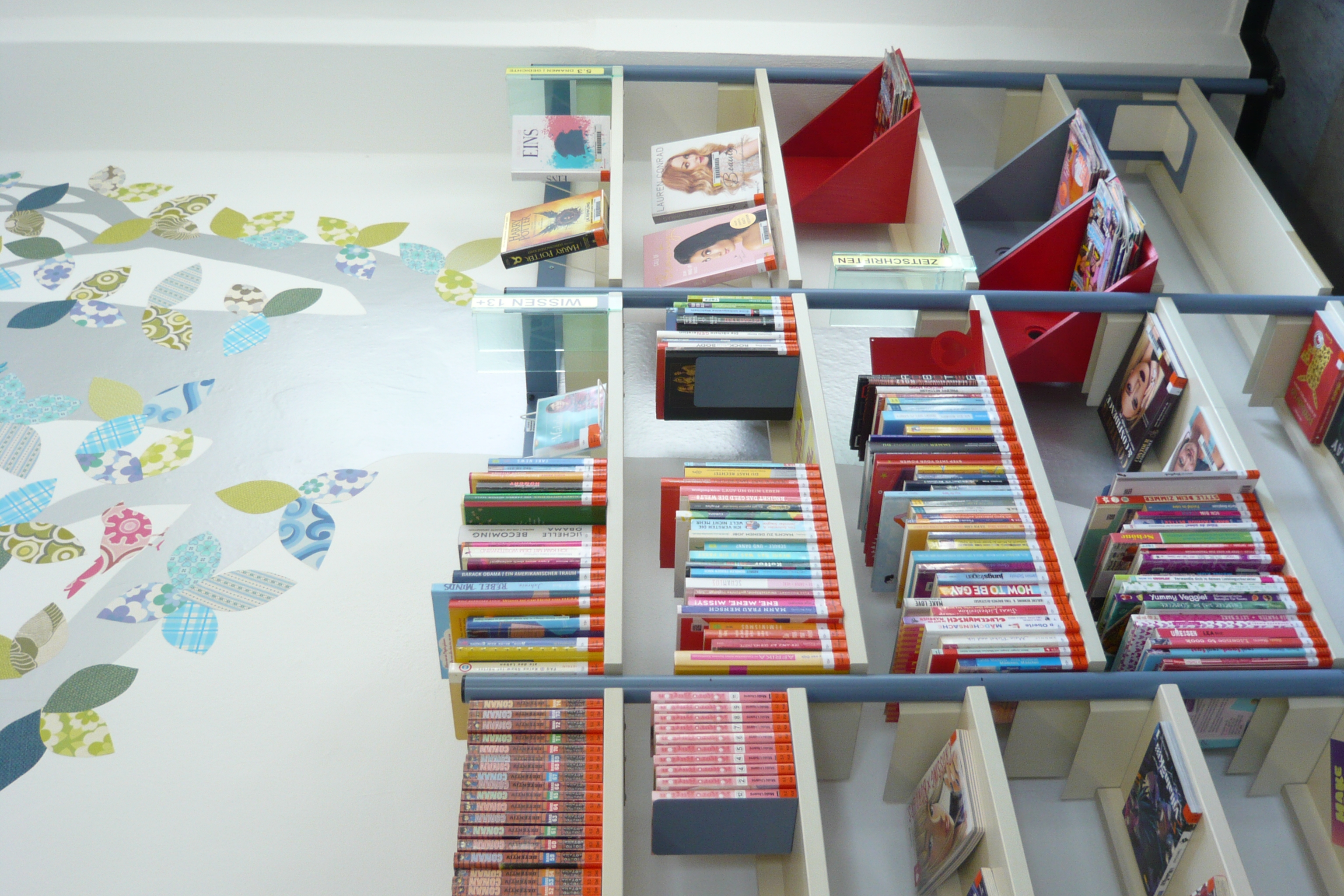Unser Jugendbereich im Erdgeschoss befindet sich noch im Aufbau. Die Junge Bibliothek ist ein Ort, um in Ruhe zu stöbern, relaxed zu lesen, Freunde zu treffen oder Hausaufgaben zu machen. WLAN ist vorhanden.